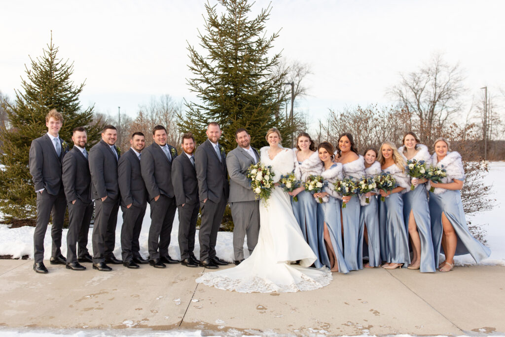 Nick and Katie got some beautiful snowy weather for their winter wedding in Fort Wayne in 2025! The icy blue bridesmaid dresses and dark gray suits looked so good against the snow.